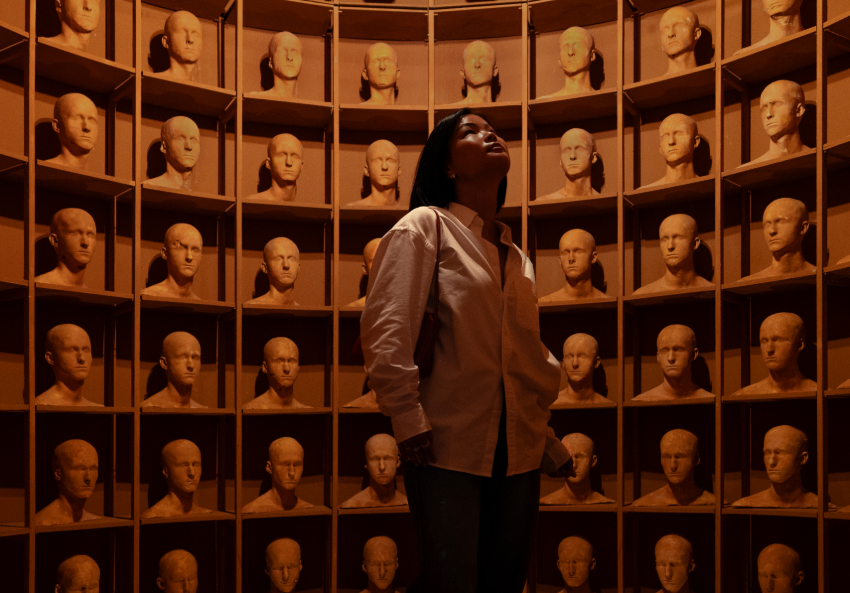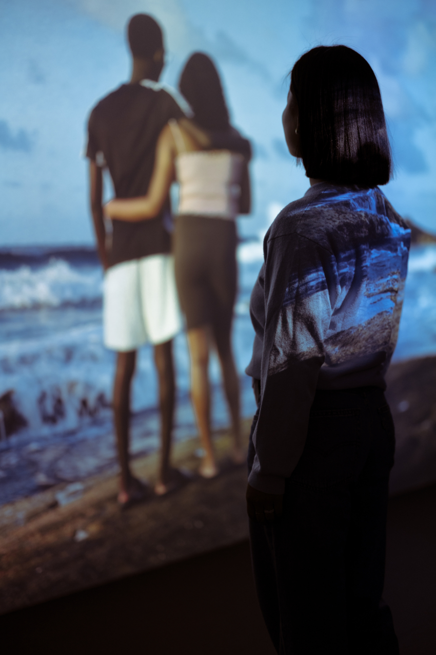 Stand at the edge of the sea in Curaçao through a sweeping video projection. Step into a circular room where sculptures repeat with ritual care. Walk through velvet curtains into a stage of vast tapestries. Drift with flickering lights, like the ones you notice when your eyes are closed.